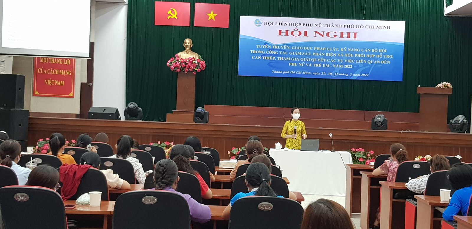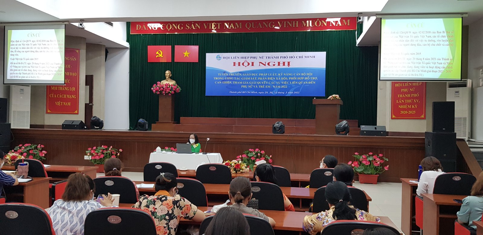 Ngày 29, 30 và 31/3/2022, Ban Thường vụ Hội LHPN Thành phố Hồ Chí Minh tổ chức Hội nghị tuyên truyền, giáo dục pháp luật, kỹ năng cho cán bộ Hội trong công tác giám sát, phản biện xã hội; phối hợp hỗ trợ, can thiệp, tham gia giải quyết các vụ việc liên quan quyền, lợi ích hợp pháp chính đáng phụ nữ và trẻ em – năm 2022 cho 360 cán bộ Hội trong thành phần: Thường trực, cán bộ phụ trách nhiệm vụ Chính sách – Luật pháp Hội LHPN thành phố Thủ Đức và 21 quận, huyện; Chủ tịch Hội LHPN 312 phường, xã, thị trấn trên địa bàn thành phố.