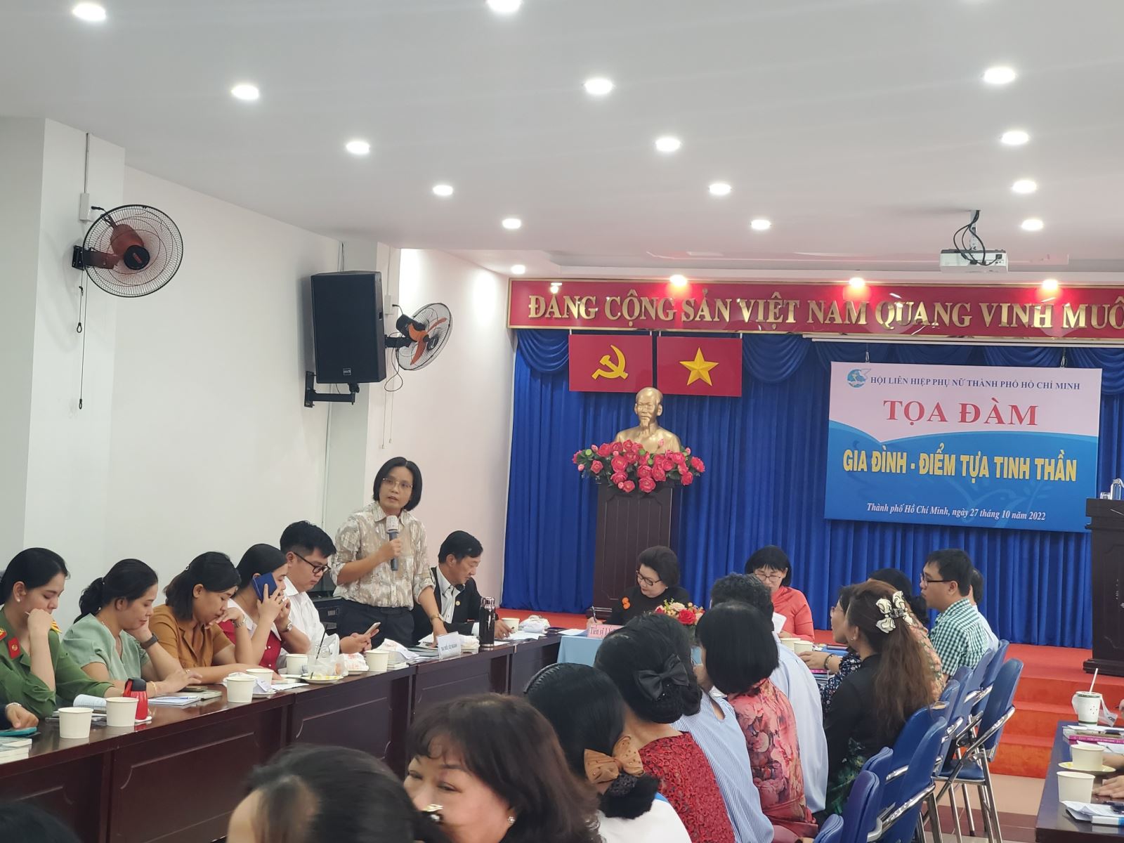 Hướng tới mục tiêu tìm giải pháp thực hiện công tác xây dựng gia đình hạnh phúc, bền vững, đặc biệt gia đình thực sự trở thành điểm tựa tinh thần vững chắc cho các thành viên trong giai đoạn hiện nay, sáng ngày 27 tháng 10 năm 2022, tại hội trường B, Hội Liên hiệp Phụ nữ Thành phố Hồ Chí Minh tổ chức Tọa đàm “Gia đình – Điểm tựa tinh thần” với sự tham dự gần 80 đại biểu khách mời là lãnh đạo các Sở, ban, ngành, các chuyên gia tâm lý và xã hội học, các chị là Thường trực Hội LHPN Thành phố Thủ Đức và quận, huyện, các đơn vị Lực lượng Vũ trang; Hội LHPN phường, xã, Chi hội trưởng Chi hội Hội phụ nữ, thành viên Ban Chủ nhiệm CLB Xây dựng gia đình hạnh phúc và các hộ gia đình trên địa bàn dân cư.