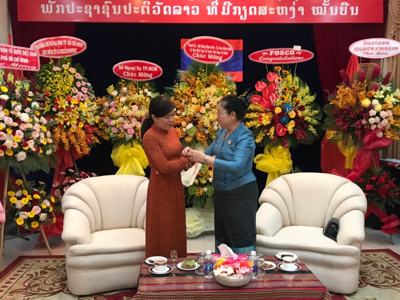 Ảnh - Bà Nguyễn Trần Phượng Trân - Chủ tịch Hội LHPN TP.HCM (người thứ 3 từ trái sang) chúc mừng TLS nước CHDCND Lào