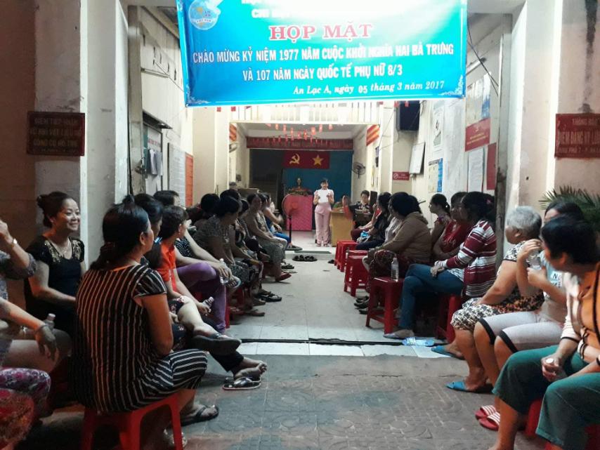 Ảnh - Chị Bạch Yến (áo hồng) vận động PN Hoa vào Hội và tổ chức Mô hình "Bữa cơm cộng đồng"