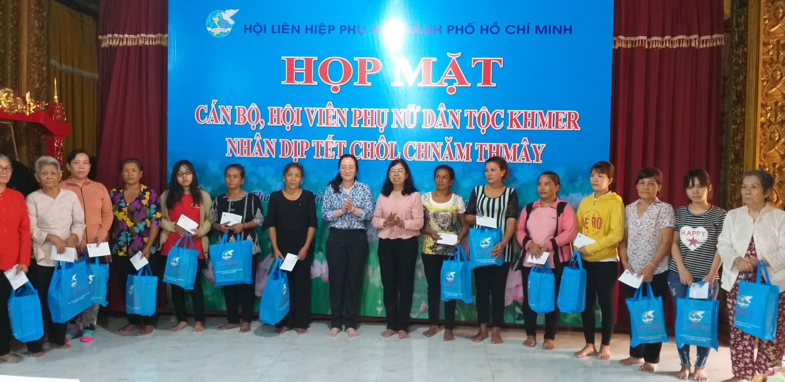 Ảnh - Bà Nguyễn Thị Ngọc Bích - Chủ tịch Hội LHPN TP (người ở giữa, áo trắng xanh) và bà Đỗ Thị Chánh - Phó Chủ tịch Hội LHPN TP (áo sơ mi hồng nhạt) trao quà cho hội viên phụ nữ dân tộc Khơme