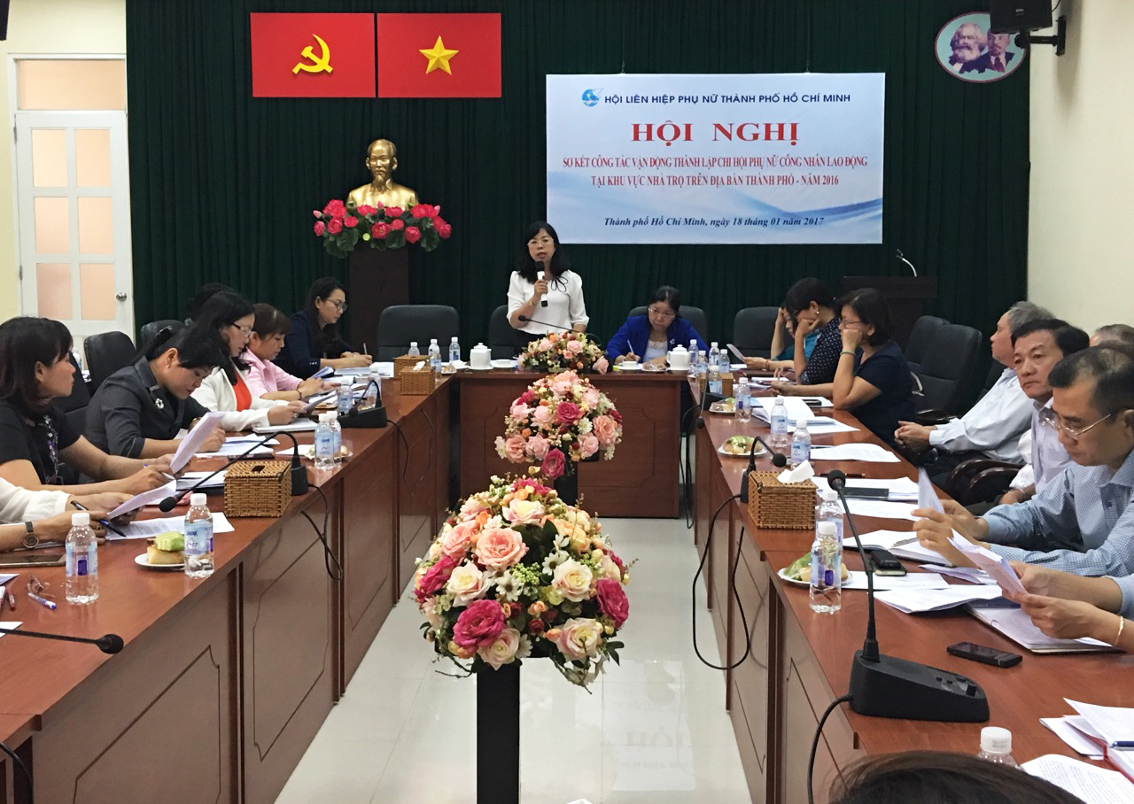 Chiều 18/01/2017, Hội Liên hiệp Phụ nữ Thành phố Hồ Chí Minh tổ chức Hội nghị Sơ kết công tác vận động thành lập Chi Hội Phụ nữ công nhân lao động tại khu lưu trú - nhà trọ trên địa bàn Thành phố năm 2016. Đến tham dự có đồng chí Nguyễn Thị Bích Ngọc – Phó Trưởng Ban Dân vận Thành ủy, đồng chí Nguyễn Thị Tô Châu – Phó Trưởng Ban Tổ chức Thành ủy; đồng chí Đỗ Thị Chánh – Phó Chủ tịch Hội LHPN Thành phố cùng các đồng chí Ban Thường vụ Hội Liên hiệp Phụ nữ Thành phố; lãnh đạo Ban Dân vận Quận, Huyện ủy và Thường trực Hội Liên hiệp Phụ nữ Quận 2, 6, 7, 8, 9, 12, Gò Vấp, Tân Bình, Tân Phú, Bình Tân, Thủ Đức, huyện Bình Chánh, Củ Chi, Hóc Môn, Nhà Bè.